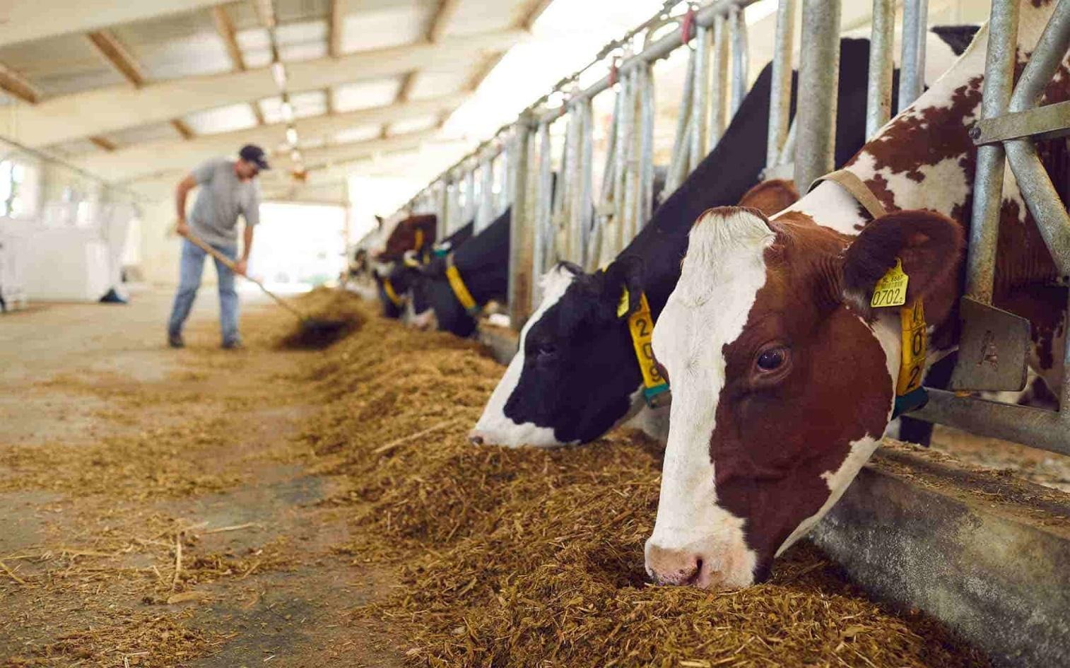 Fuente: https://es.vecteezy.com/foto/15230661-agricultor-trabajando-y-controlando-su-ganado-en-la-granja-lechera-industria-agricola-concepto-de-agricultura-y-ganaderia-vaca-en-la-granja-lechera-comiendo-heno-establo