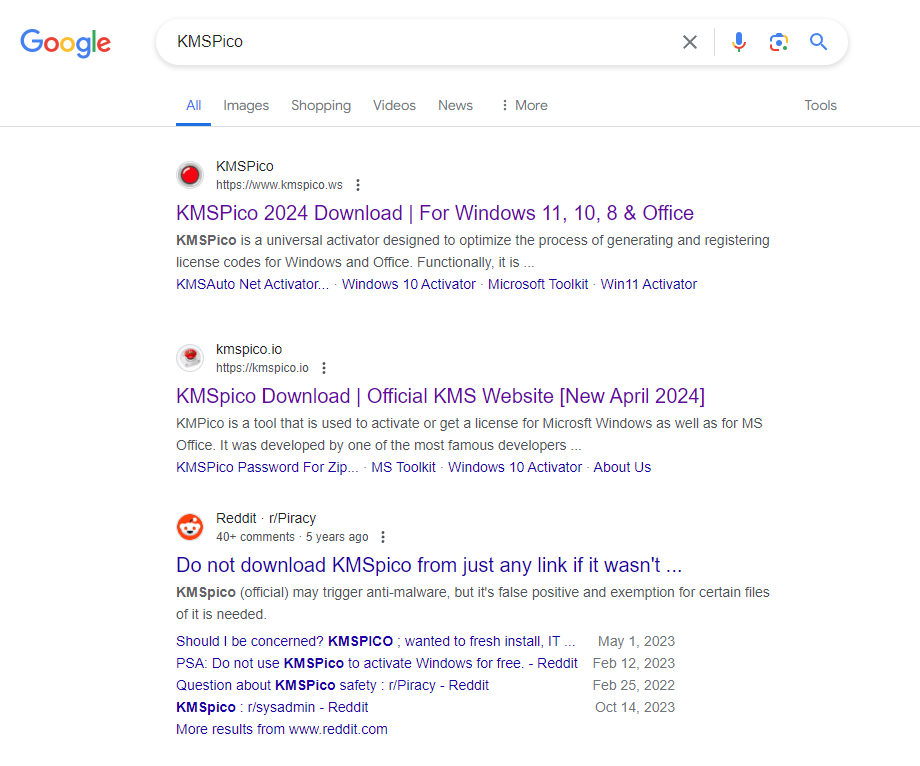 al primer resultado del buscador (kmspico[.]ws). La herramienta se