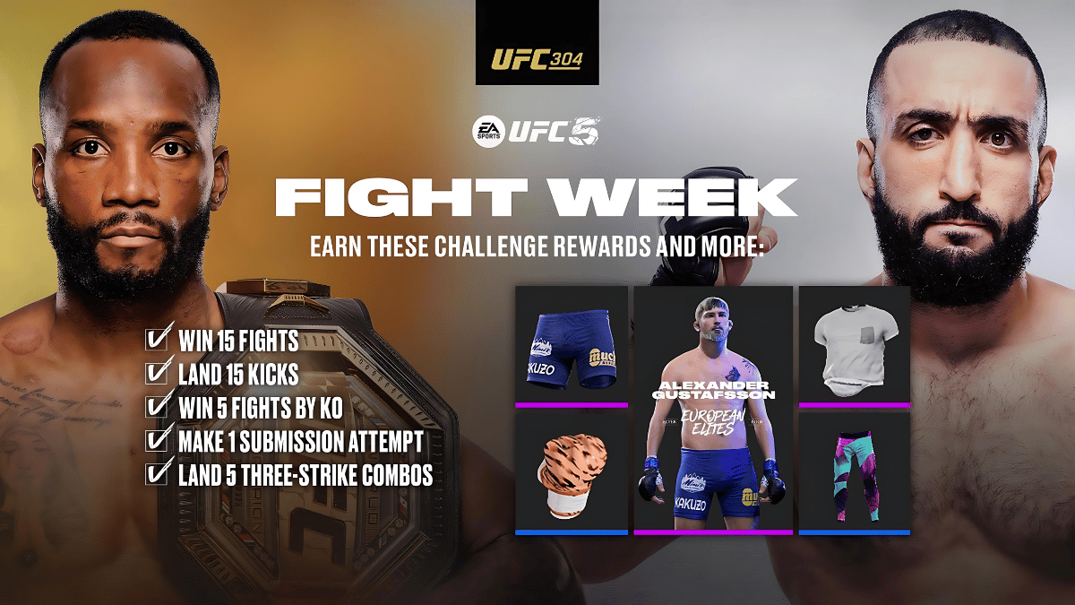 La Semana de Pelea de UFC 304 comienza hoy en UFC 5. A través de la opción Fight Pick’ems, los jugadores pueden seleccionar a sus favoritos para ganar cada pelea de la cartelera principal. Acertar en el ganador y el método de victoria desbloquea premios exclusivos en el juego. Completar la Tarjeta de Golpes recompensará a los fans con artículos desbloqueables, incluyendo uno de los nuevos Alter Egos: Alexander Gustafsson de UFC 165.